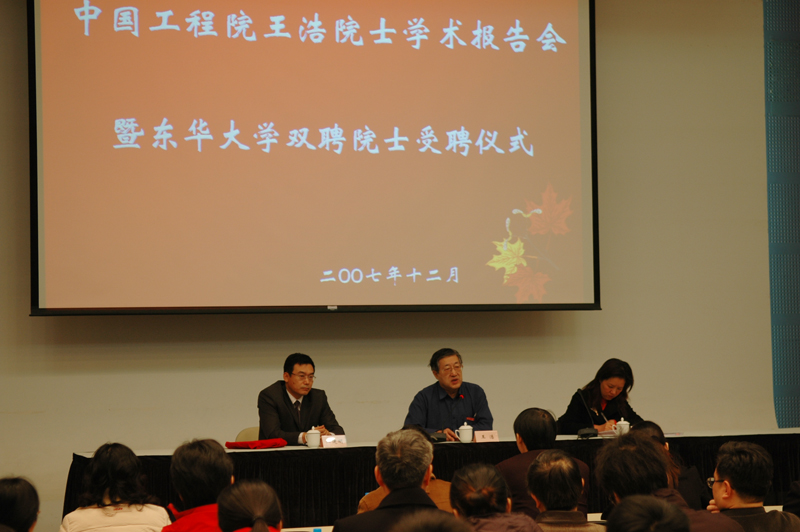 12月24日,中国工程院院士王浩学术报告会暨东华大学双聘院士受聘仪式在图文信息大楼第二报告厅隆重举行。副校长江建明为王浩院士颁发证书并佩戴校徽。人事处处长袁孟红主持了受聘仪式。