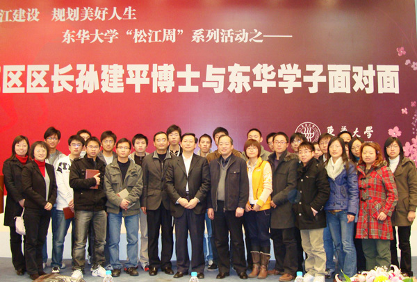 11月27日上午,作为“融入松江建设,规划美好人生”东华大学松江周系列活动之一的“松江区区长孙建平博士与东华学子面对面”交流会在东华大学松江校区图文信息大楼第二报告厅召开。我校副校长宋立群、学生就业服务中心主任宋丽贞出席,校研究生会副主席秦泽峰同学主持。