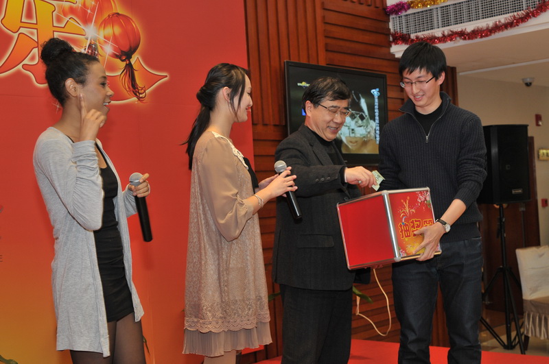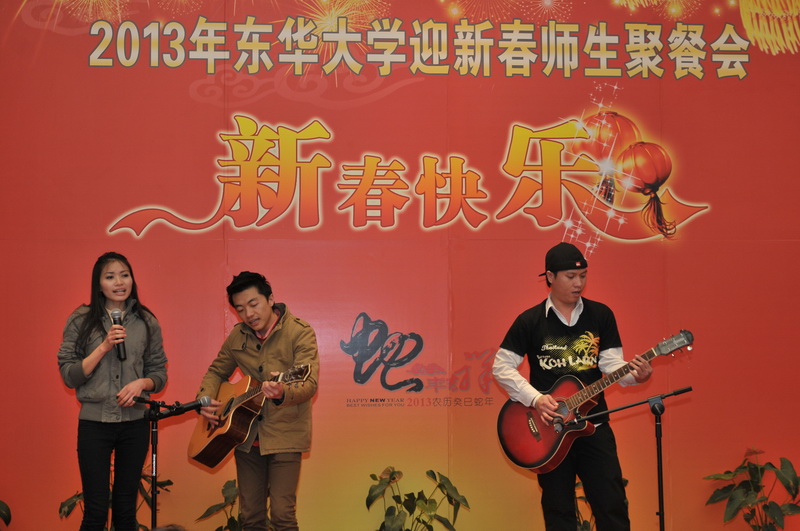 朱民书记和徐明稚校长分别致新春祝辞,祝愿同学们在新的一年里学业进步,生活安康。聚餐会上,师生自编自演的文艺节目现场上演了一场东华版“春节联欢会”。现场抽奖环节为留校过年的学生准备了丰富的奖品,除此以外,学校还为每位留校学生准备了贺岁礼包,并特意为家境贫困的同学送来了新年慰问金。