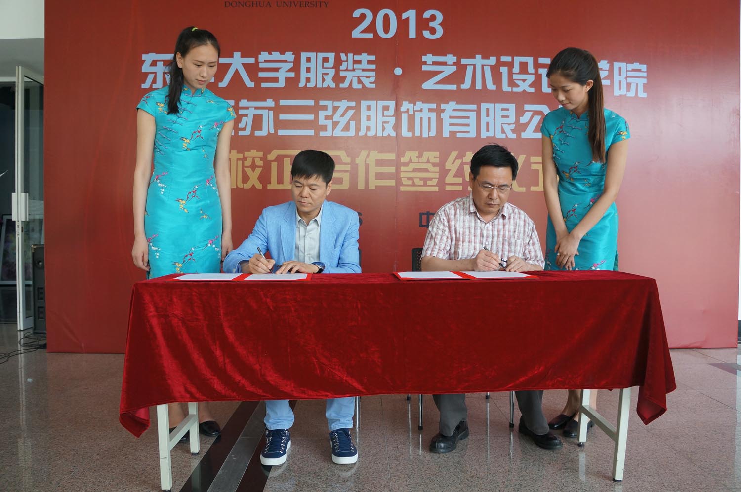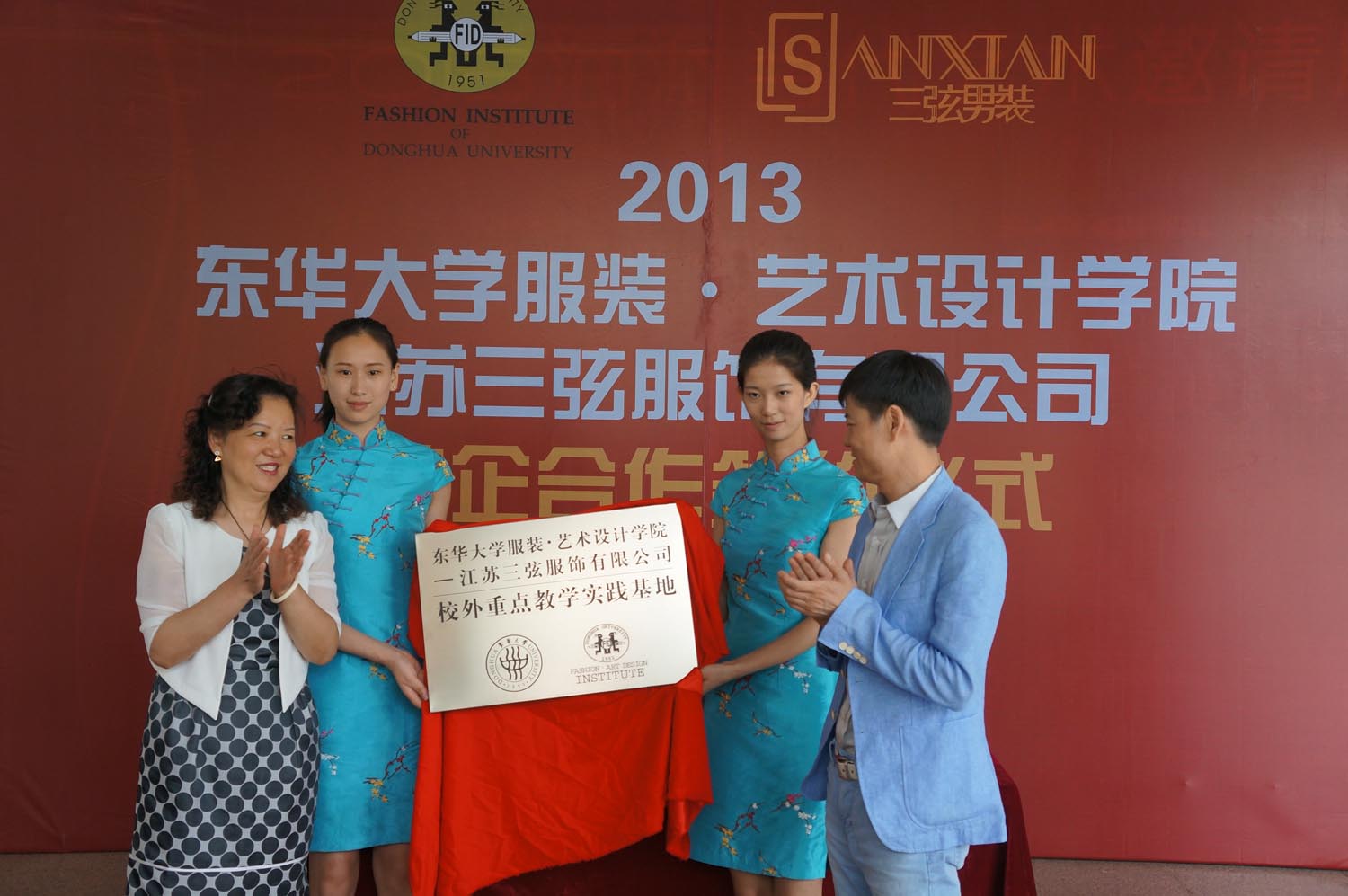 仪式上,刘春红与吴栋标签订“三弦”基金捐赠协议,并向企业颁发捐赠证书。袁孟红、刘晓刚与分别与吴栋标签署“东华大学服装•艺术设计学院—江苏三弦服饰有限公司校外重点教学实践基地”协议书、“东华大学服装•艺术设计学院服装与服饰设计专业本科毕业设计”校企合作协议书。现场还举行了揭幕仪式。