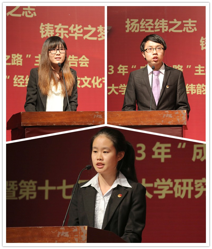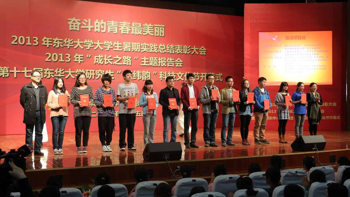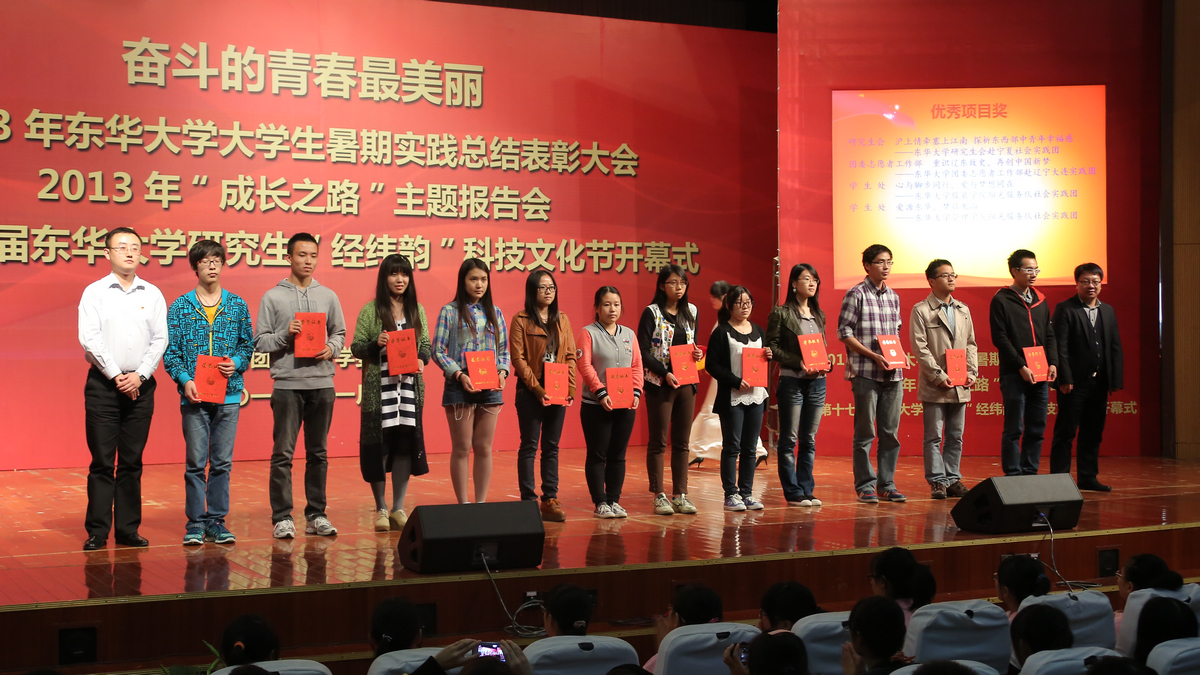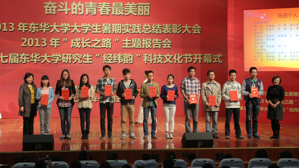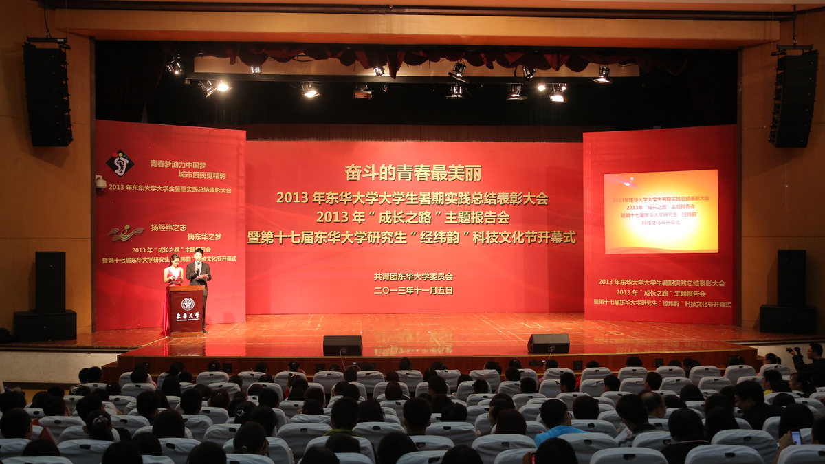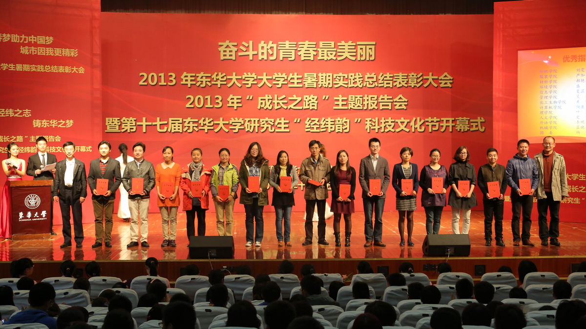 11月5日下午,2013年东华大学大学生暑期社会实践总结表彰大会、2013年“成长之路”主题报告大会暨第十七届东华大学研究生“经纬韵”科技文化节开幕式在松江校区锦绣会堂举行。