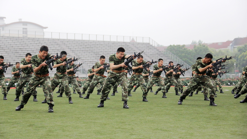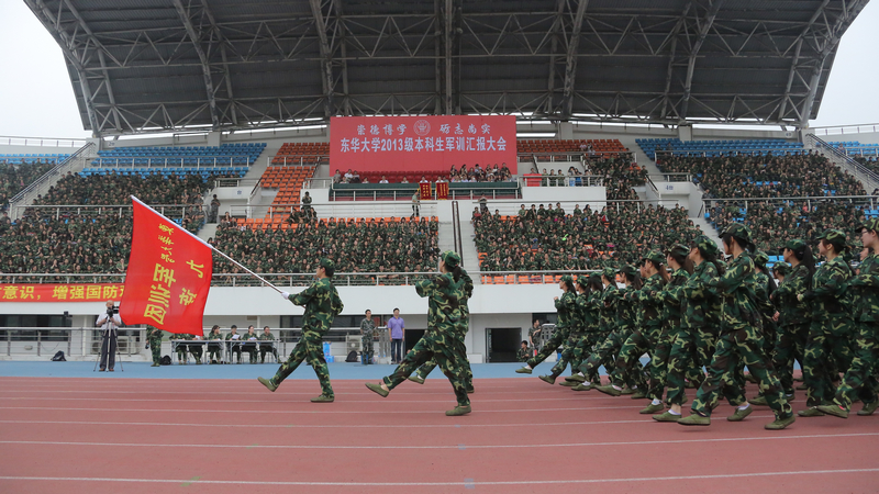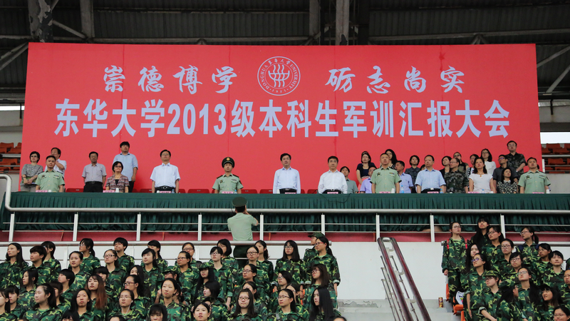 7月4日上午,东华大学2013级本科生军训汇报大会在松江校区体育场举行。