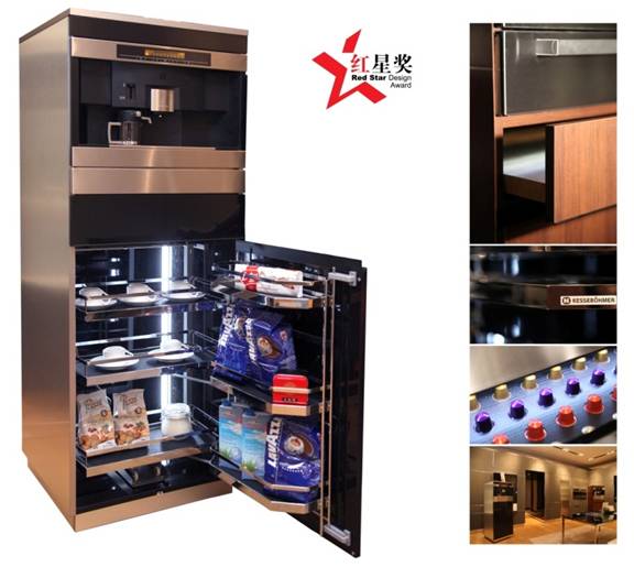 “Coffee Box咖啡小站”由产品设计系主任吴翔教授领衔,教师吴春茂、学生刘成等组成的设计团队为德国凯斯宝玛(Kesseboehmer)公司开发设计,设计理念为“感受设计之美,体验实用之便”,它不仅可以随意移动至客厅、餐厅等不同地点为宾朋制作一杯精致的咖啡,还提供了一个专业收纳解决方案,包含顶级咖啡机、茶具加热盘、咖啡胶囊收纳抽屉、联动拉篮等。