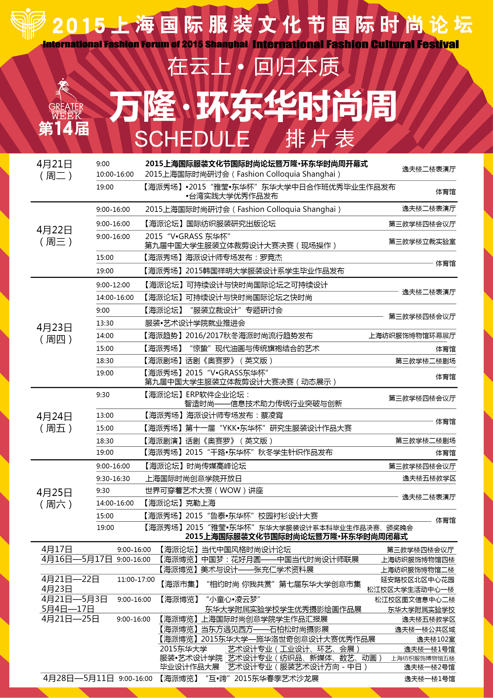 更多详情请进入“2015上海国际服装文化节国际时尚论坛暨万隆·环东华时尚周”官方网站