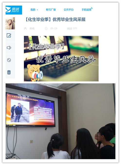 优秀毕业生风采展借助了易班、微信等网络平台进行宣传,同时在化工生物学院楼特色文化大厅屏幕中滚动播放,通过线上线下的宣传,以优秀毕业生的先进事迹号召和鼓舞更多的同学以他们为榜样,践行“崇德博学,砺志尚实”的校训,努力开创更辉煌的明天。