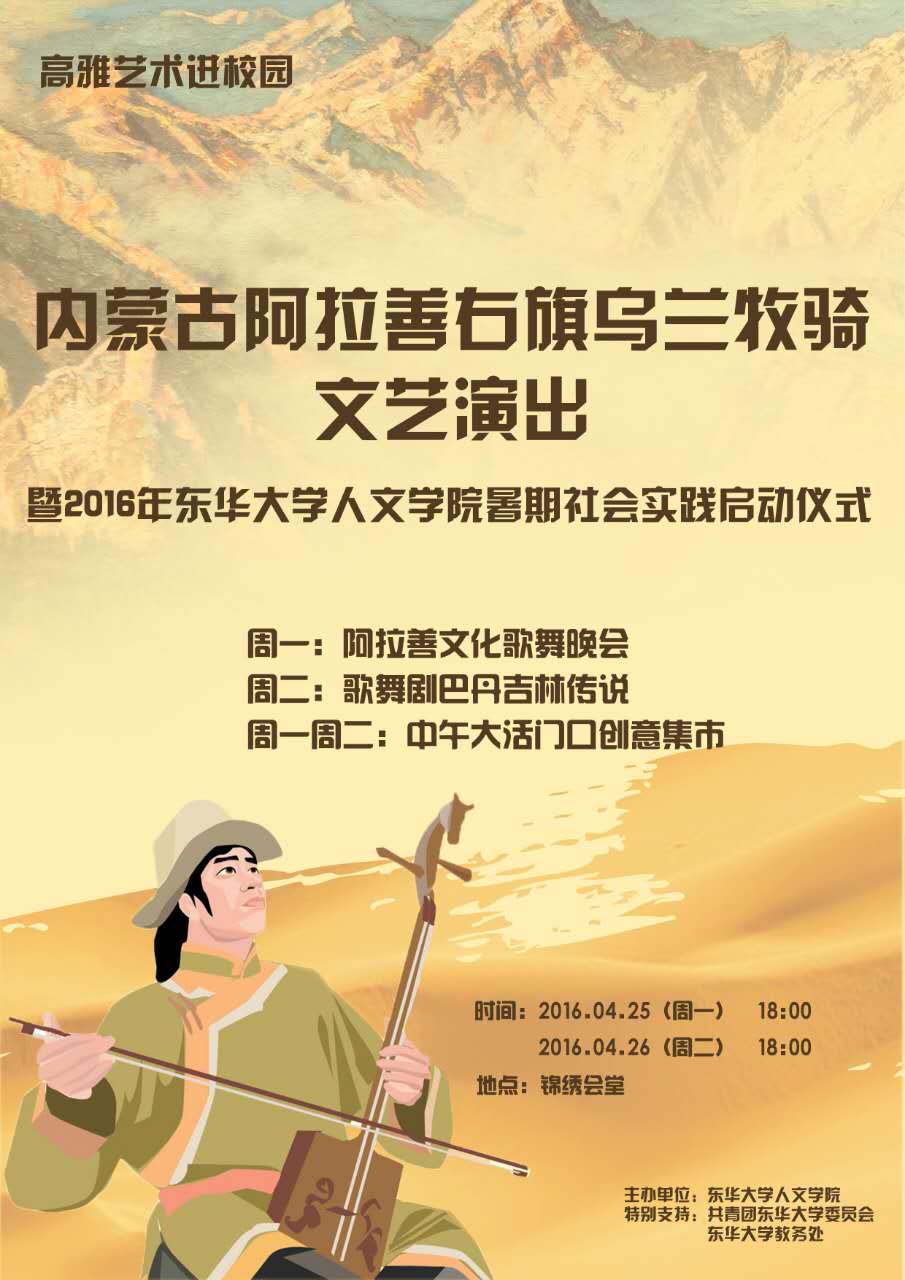 苍天圣地阿拉善,世界非遗进校园。由人文学院主办,共青团东华大学委员会、东华大学教务处特别支持的高雅艺术进校园——内蒙古阿拉善右旗乌兰牧骑文艺演出暨2016东华大学人文学院暑期社会实践启动仪式,将于4月25日、4月26日在我校松江校区锦绣会堂举行,乌兰牧骑文工团将为我们呈现两场草原文化的视听盛宴。