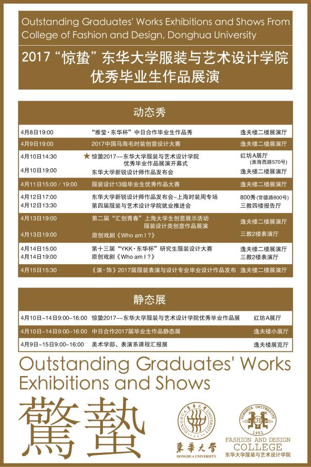 2017“惊蛰”东华大学服装与艺术设计学院优秀毕业生作品展演将于2017年4月8日在东华大学延安路校区拉开帷幕。本次展演以“惊蛰”为主题,以静态展、动态秀、原创戏剧、就业推进会为载体,表达“微雨众卉新,一雷惊蛰始”的寓意,呈现即将完成学业、走向社会的青年学子们的艺术创造力和设计表现力。
