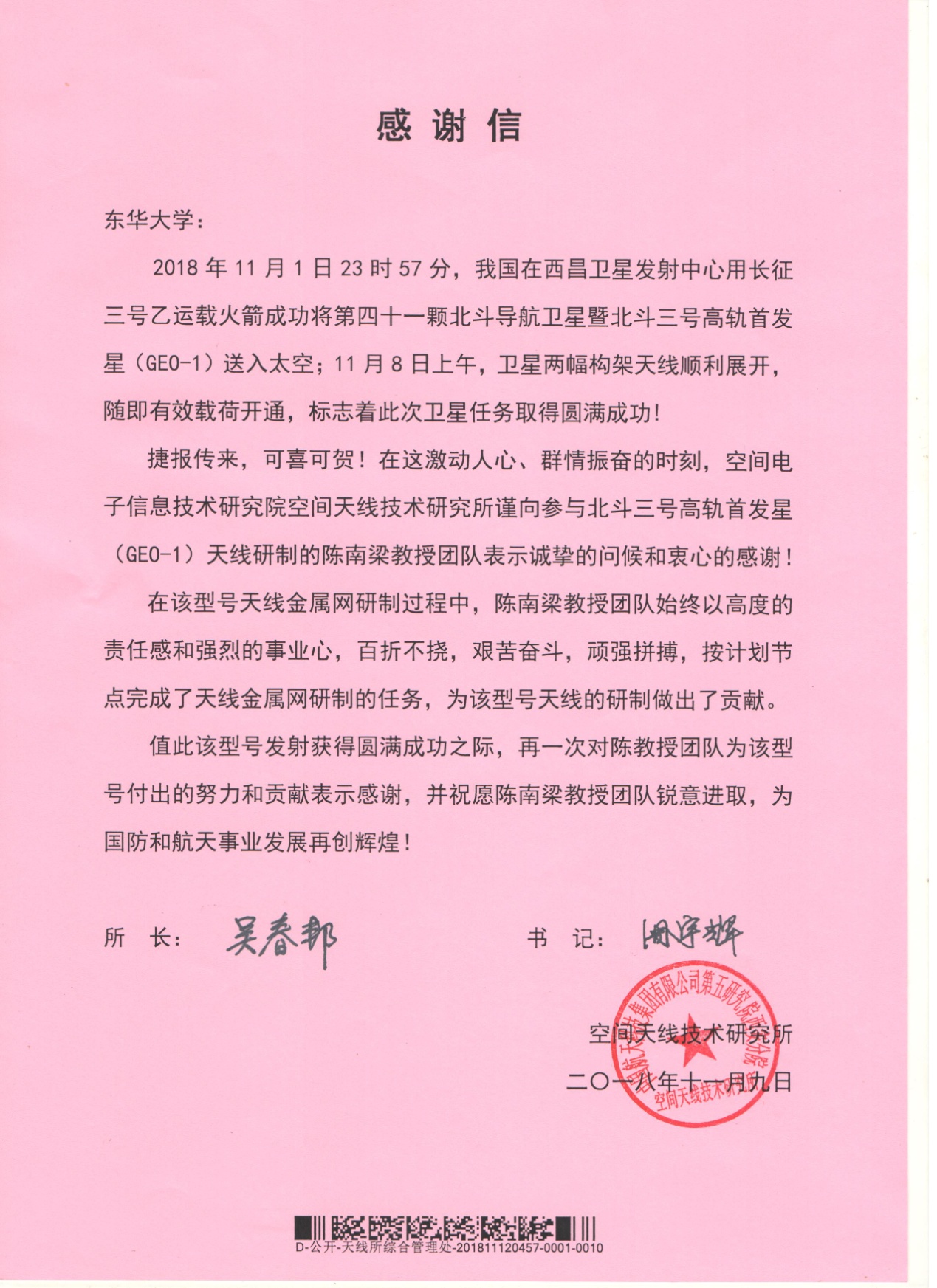 (航天五院空间天线技术研究所给团队发来的感谢信)