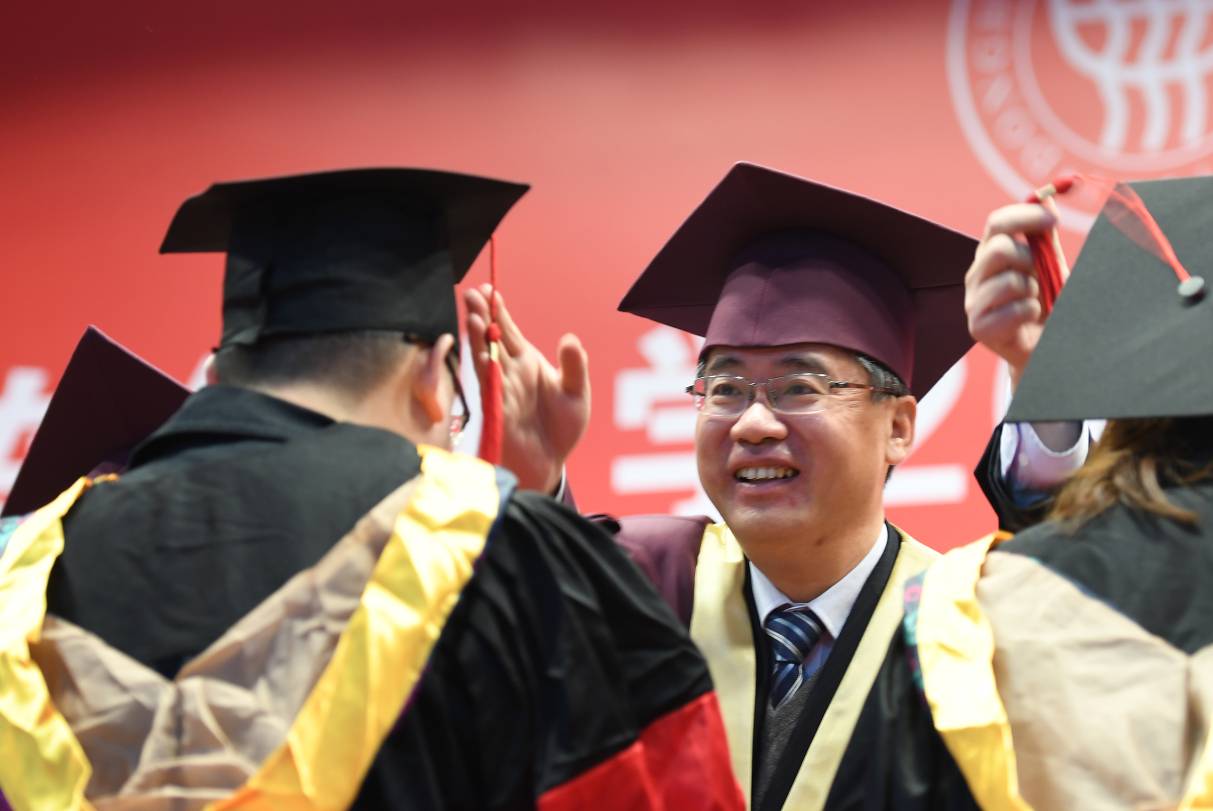 (朱民宣读优秀毕业生名单并为毕业生拨穗)