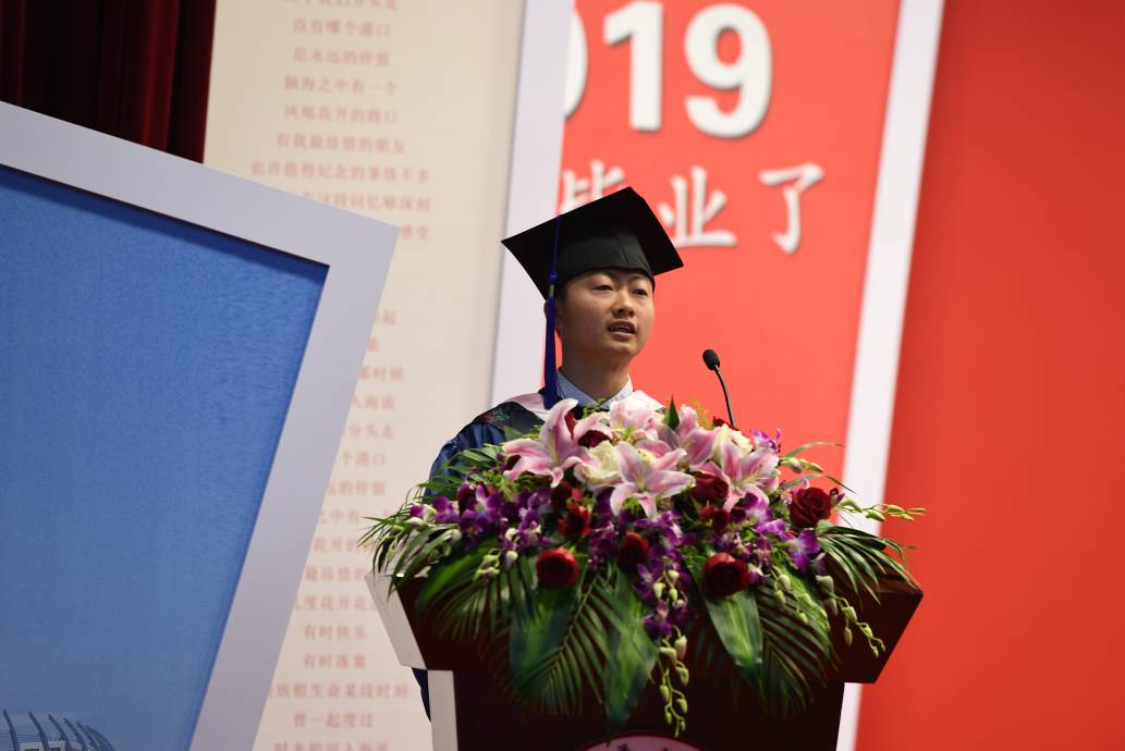 马克思主义学院谭勇、旭日工商管理学院毛佩琦作为毕业生代表发言。谭勇回想起在东华的奋斗时光,表达了对母校悉心栽培的诚挚感谢与衷心祝福,希望毕业生们能够秉承东华校训“崇德博学,砺志尚实”,面对各种诱惑、面对各种困难、面对偶尔孤独的自己,坚持锐意进取、勇往直前。毛佩琦带领毕业生们漫步校园深处,跟着一草一木一建筑,回顾了三年校园生活的点滴足迹,并深情祝福母校桃李万千五洲芬芳。她号召毕业生们要时刻牢记身上东华人的印记,勇往直前,不忘初心,砥砺前行,为国家经济建设和社会进步做出应有的贡献。