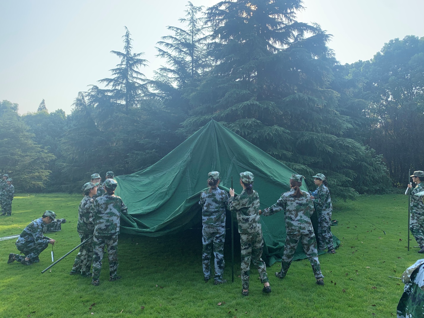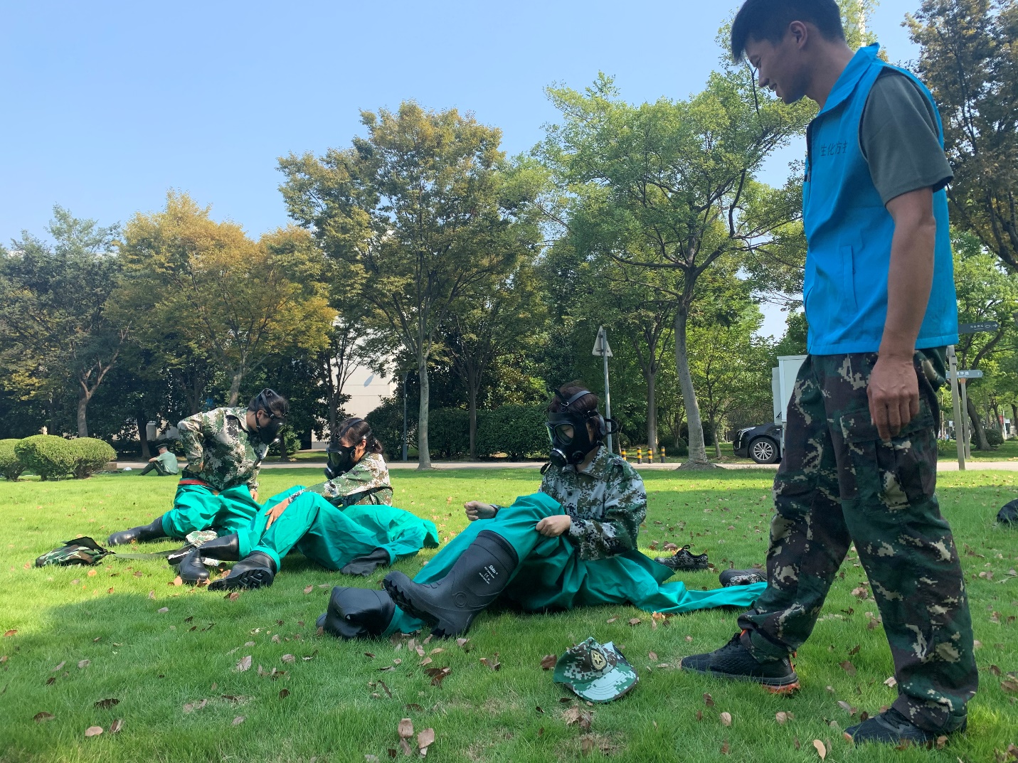 在训练营的“核生化防护”项目中,同学们在教官的指导下穿上防毒面具和防护服,想着几个月前,奋斗在一线的医疗工作者们的生活常态,在面具下沉闷的呼吸,汗淋淋的衣服紧贴着皮肤,心中对他们的敬畏又多了几分。“战场医疗救护和战术基础”中教官细致生动的阐述、解读紧急救助过程,强调抢救手法及抢救时机,同学们也将彼此当做“病人”进行练习,紧张而有趣。“班用帐篷的搭建和使用”环节,同学们团结合作,一步步在教官的指导下,学习如何打地桩,立柱子,挂帐篷。得益于东华大学丰富多样的绿地生态环境,同学们仿佛置身野外,有些同学干脆偷偷地躺在帐篷之中,打个滚,伸个懒腰,和草地来个亲密接触,若碰到教官掀开帐篷,再一个鲤鱼打挺站起来。“徒步行军拉练”中,教官对野外单人生存技能进行了详细地讲解:如何节约体力,怎样获得救援以及通过简易装置集水,同学们也明白了一个人的力量可以多么强大。