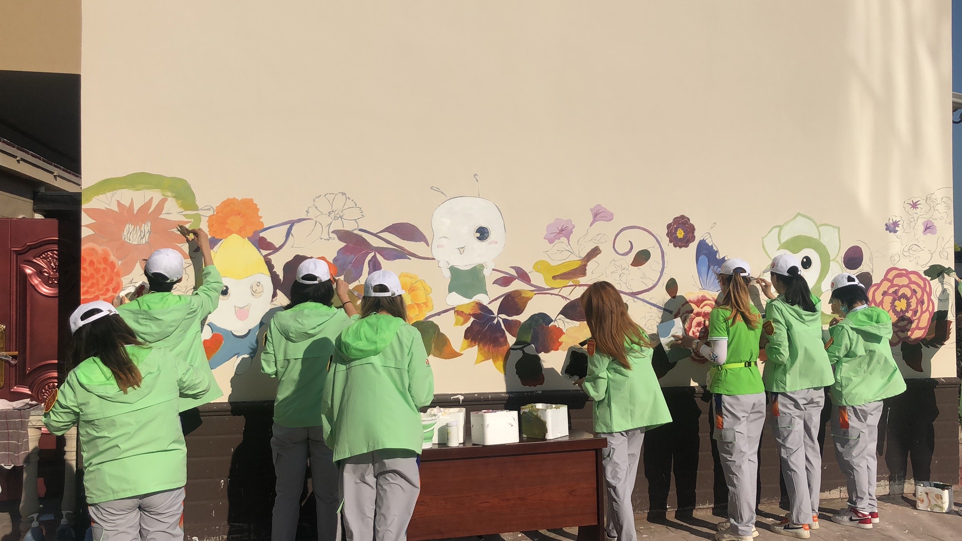 志愿者们在每日10小时的服务工作之余,还开展了“红色寻访”活动,寻找园区内的红色地标,并结合国内展区各省市的红色文化讲述党史故事、分享红色精神,自编自导录制8期“艺说·团团说花博”系列视频,截至目前已播出4期的累计阅读量达700余人次。同时,志愿者们依托设计学专业优势,在志愿者之家的墙上绘制花博会主题墙绘,营造了良好志愿者文化,受到主办方和各高校的好评。