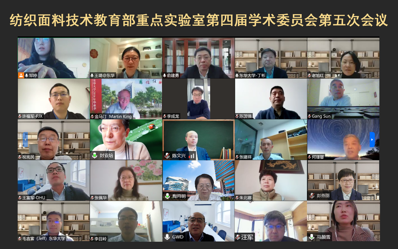3月17日,纺织面料技术教育部重点实验室第四届学术委员会第五次会议在我校召开。我校中国工程院院士、重点实验室学术委员会主任俞建勇出席会议并致辞。浙江理工大学校长、中国工程院院士陈文兴教授,美国北卡罗莱纳大学金马丁教授,美国加州大学戴维斯分校孙刚教授,香港理工大学陶肖明教授,中国棉纺织行业协会书记、监事长朱北娜教授级高工等15位学术委员会委员线上出席会议,重点实验室管理委员会成员、学校相关部处负责人、相关学院负责人、重点实验室固定人员及青年教师代表等参会。