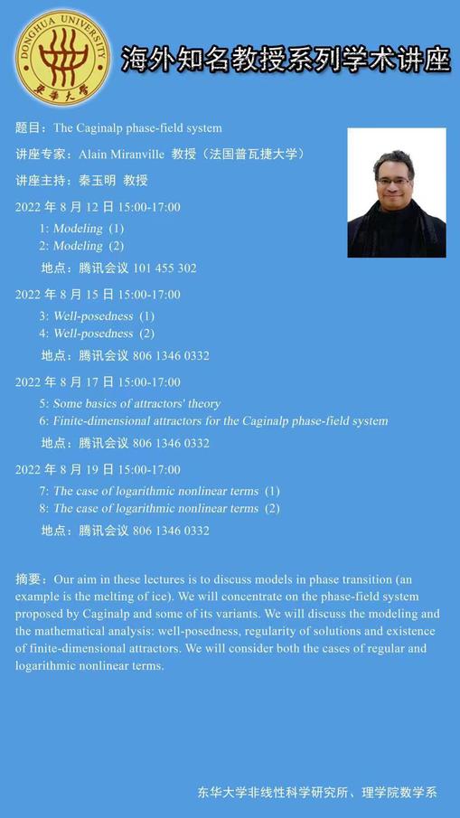 Alain Miranville教授是国际知名无穷维动力系统专家,法国普瓦捷大学应用数学杰出教授,AIMS的微分方程与动力系统系列著作的主编(2017-至今),AIMS Mathematics的主编(2016-至今),Discrete and Continuous Dynamical Systems S 的联合主编 (2008-),同时是 Adv. Nonlinear Anal., Appl. Math. & Optim., Comm. Pure Appl. Anal., J. Nonlinear Funct. Anal., Math. Meth. Appl. Sci. 及 Nonautonomous Dynamical Syst.的编辑。法国普瓦捷大学数学及其应用实验室数学图形及健康研究团队的负责人, 数学及其应用实验室偏微分方程团队的负责人。