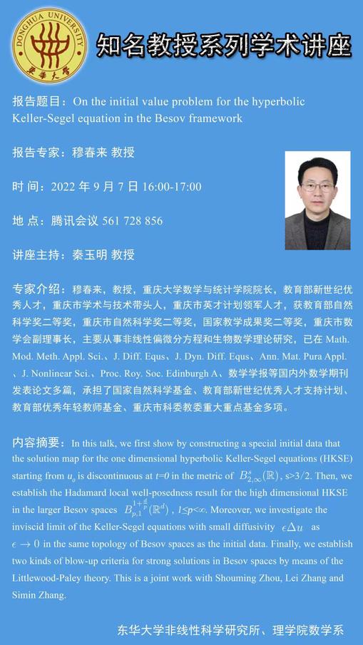 穆春来教授,重庆大学数学与统计学院院长,教育部新世纪优秀人才,重庆市学术与技术带头人,重庆市英才计划领军人才,获教育部自然科学奖二等奖,重庆市自然科学奖二等奖,国家教学成果奖二等奖,重庆市数学会副理事长,主要从事非线性偏微分方程和生物数学理论研究,已在Math. Mod. Meth. Appl. Sci.、J. Diff. Equs、J. Dyn. Diff. Equs、Ann. Mat. Pura Appl.、J. Nonlinear Sci.、Proc. Roy. Soc. Edinburgh A、数学学报等国内外数学期刊发表论文多篇,承担了国家自然科学基金、教育部新世纪优秀人才支持计划、教育部优秀年轻教师基金、重庆市科委教委重大重点基金多项。