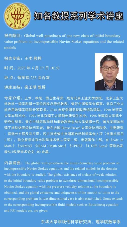 王术,北京工业大学教授、博士生导师,北京工业大学数学一级学科博士学位授权点责任教授。曾任中国数学会理事、北京工业大学应用数理学院院长等职务。2016年获得国务院政府特殊津贴。1990年河南大学本科毕业,1993年北京理工大学硕士研究生毕业,1998年南京大学博士研究生毕业。曾在中科院数学所和奥地利维也纳大学做博士后,曾在美国加州理工学院做高级访问学者,曾在法国Blaise Pascal大学做访问教授。主要研究:偏微分方程及其应用。现主持或曾主持国家自然科学基金8项(含重点项目1项),独立获得北京市科学技术奖二等奖1项,出版著作3部,在《Adv. In Math.》《ARMA》《SIAM J Math Anal》《CPDE》《J. Diff. Eqns》等杂志发表SCI收录学术论文100余篇。