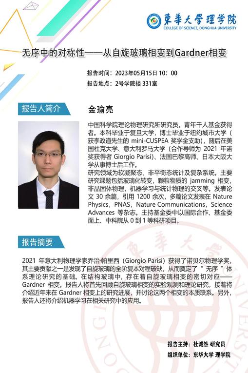 金瑜亮,中国科学院理论物理研究所研究员。本科毕业于复旦大学,博士毕业于纽约城市大学(获李政道先生的mini-CUSPEA奖学金支助),随后在美国杜克大学、意大利罗马大学(合作导师为2021年诺奖获得者 Giorgio Parisi)、法国巴黎高师、日本大阪大学从事博士后工作。研究领域为软凝聚态、非平衡态统计及复杂系统。主要研究课题包括玻璃化转变,颗粒物质的jamming相变,非晶固体物理,机器学习与统计物理的交叉等。发表论文30余篇,引用1200余次,多篇论文发表在Nature Physics,PNAS,Nature Communications,Science Advances等杂志。主持基金委中以国际合作、基金委面上、中科院从0到1等科研项目。