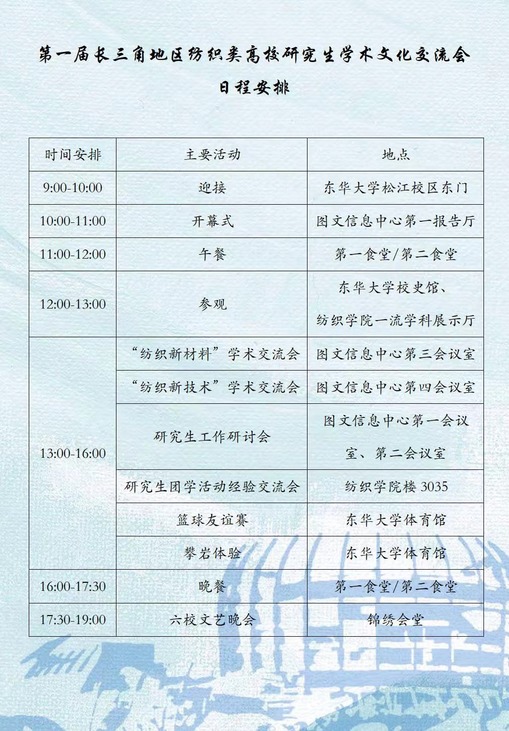 为增进长三角地区纺织类高校研究生学子的互动交流,促进学科知识的相互融合和思想碰撞,全方位展现六校研究生的学术素养和综合素质,提升创新人才培养工作水平,努力实现纺织类研究生教育的科学发展、协同发展,第一届长三角地区纺织类高校研究生学术文化交流会定于2023年5月26日至5月27日在东华大学举办。