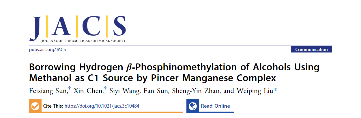 相关研究成果《钳形锰催化甲醇作为C1源的醇β-膦甲基化反应》(Borrowing Hydrogen β Phosphinomethylation of Alcohols Using Methanol as C1 Source by Pincer Manganese Complex)在国际著名期刊《美国化学会志》(Journal of the American Chemical Society)上发表。化学与化工学院2021级博士研究生生孙飞翔和2022级博士研究生陈鑫为论文共同第一作者,研究生王思轶、孙帆和赵圣印教授为该论文的共同作者,刘为萍特聘研究员为论文的通讯作者,东华大学为唯一通讯单位。该研究工作得到了国家自然科学基金委和中央高校基本科研业务费学科交叉重点计划的支持。