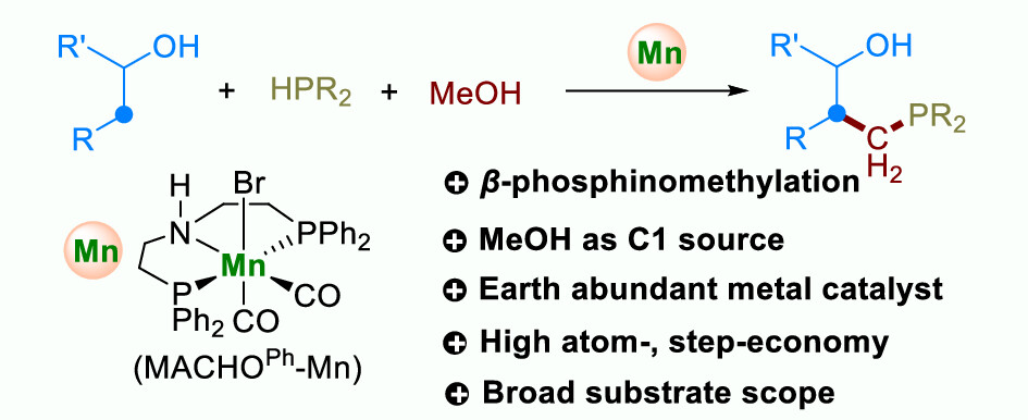 刘为萍研究员课题组一直致力于丰产金属锰催化醇脱氢的选择性偶联反应研究。在前期的工作中,该课题组利用钳形锰催化借氢反应实现了醇的β-甲基/烷基化三组分偶联反应(Angew. Chem. Int. Ed. 2023, 62, e202215882)和两分子二级醇的选择性交叉偶联反应(Angew. Chem. Int. Ed. 2023, 62, e202303433)。在上述工作的启发下,作者设想通过添加亲核性的膦试剂来“阻断”第一步加氢反应过程,即:首先生成的α,β-不饱和羰基化合物中间体与膦试剂率先发生Michanel加成反应,随后该加成产物被前面“借走”的氢“还回来”形成γ-羟基膦化合物。基于前面的工作基础,该课题组近日通过锰催化的借氢策略成功实现了这一设想,即:锰催化甲醇作为C1源的醇β-膦甲基化反应。该反应无需额外添加氧化剂和还原剂,仅产生水和氢气作为副产物,符合绿色化学的发展理念,为构建结构多样性的有机膦化合物提供了一种新的有效途径。