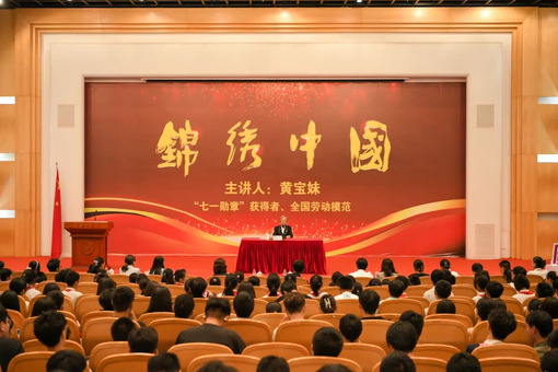 (学校开设中国系列思政大课“锦绣中国”,图为“七一勋章”获得者、全国劳模、校友黄宝妹为青年学生授课)