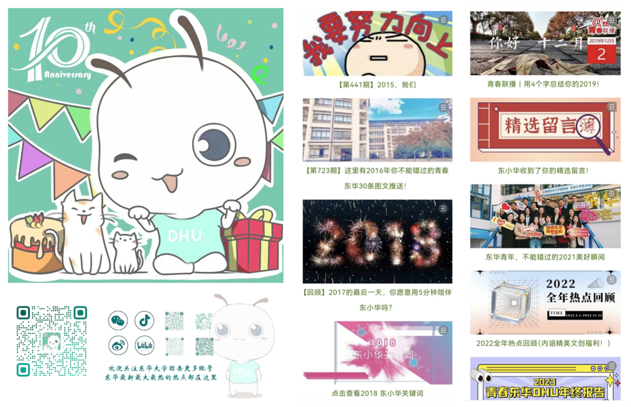 “青春东华DHU”是我校团委微信公众号,由团委宣传部·青春东华传媒中心负责运营,聚焦东华青年特点探索建设“一站式”内容生产中心,以“有趣——兴趣使然的凝聚力、有料——成长成才的竞争力、有腔调——美好校园生活新姿势”为内容定位,致力于打造东华青年专属的媒体宣传矩阵。以“青春东华DHU”为IP,校团委积极打造覆盖“青春东华DHU”微信公众号及视频号、B站、微博、“青春东华”网站、《东华青年》杂志以及“周周讲”校园讲坛等线上线下相结合的团属媒体宣传矩阵,常年建设了包括“DHU聊天室”“东华食验室”“东华棒棒堂”“校园街拍”“微调研”“新生代”“小喇叭”以及“青年视野”等一系列专题栏目,始终坚持“青年意识——来源青年,依靠青年,服务青年”“导向意识——把握团属媒体内容运营的方向性”“用户意识——服务校园美好生活的多元需要”运营理念,起到了良好的思想引领作用。同时,秉持用丰富的内容、近距离互动,为同学们拓展视界、丰富校园生活的理念,2023年,先后举办多场大型校园文化活动,包括“周周讲”“水木年华歌友会”“美食文化节”“外滩亮灯仪式”等,受到学校师生广泛好评。