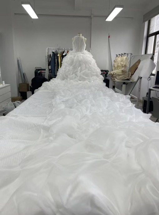 李黎身着的婚纱由紧身胸衣和宽大裙摆组成,裙摆的底座部分用整块的旧床单制作,在头纱配饰上,采用了以PET塑料瓶热熔而成的花饰,蕴含着可持续时尚设计理念。“我们在设计过程中打破了塑料瓶的禁锢,通过再次设计成花朵形状的方式唤起对自然的保护和热爱。”上海国际时尚创意学院大四服装创意设计班印尼留学生陈素鑫(Crista)谈到。