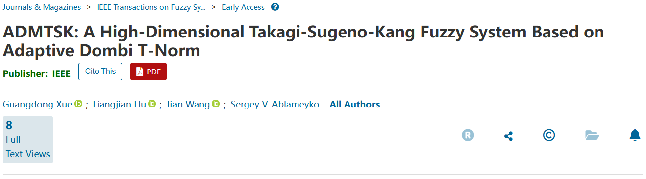 薛广东在国际知名期刊《IEEE模糊系统汇刊》(IEEE Transactions on Fuzzy Systems, IEEE TFS)发表了题为“ADMTSK:基于自适应Dombi T范数的高维Takagi-Sugeno-Kang模糊系统”(ADMTSK: A High-Dimensional Takagi-Sugeno-Kang Fuzzy System Based on Adaptive Dombi T-Norm)的学术论文。薛广东老师为论文第一作者,东华大学为论文第一单位。研究工作获得了中央高校基本科研业务费的资助。