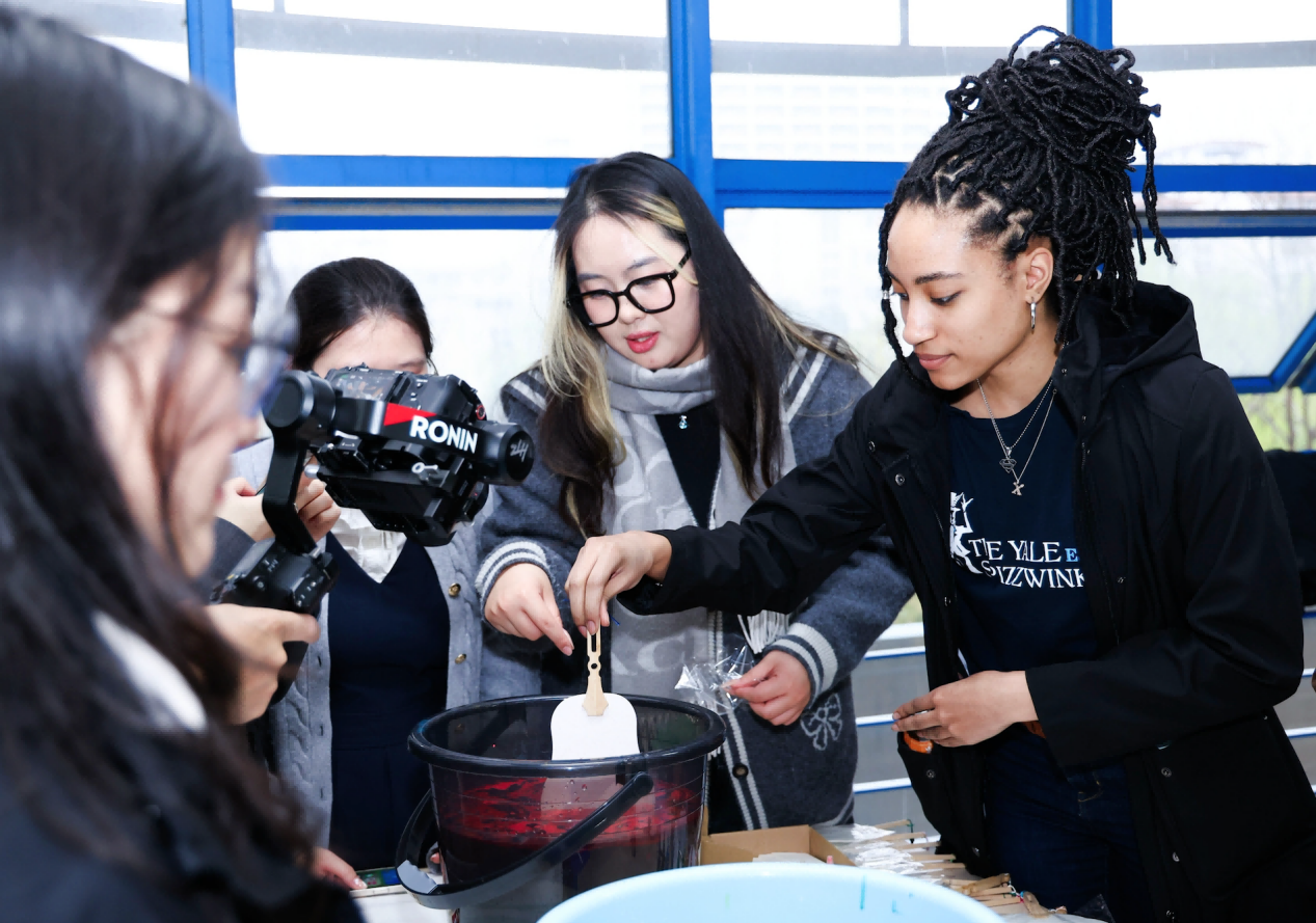 除了联袂开展音乐会外,蓝甲虫合唱团还与东华大学学生民乐团、合唱团师生以及学生骨干、青年志愿者进行深入交流互动。中美青年一起参观东华大学松江校区和广富林文化遗址。在东华大学学生活动中心,民乐团的同学们以精湛的技艺展示唢呐、古筝、琵琶、阮、笛子等民族乐器的独特魅力。合唱团的同学们与蓝甲虫合唱团进行合唱技巧切磋。中美青年还共同体验了中国非遗——漆扇的制作,感受中国传统文化的深厚底蕴,在互动中促进中外文化的交流互鉴。