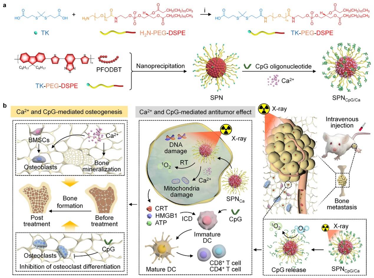 针对骨转移瘤的治疗难题,李静超研究团队设计了一种多功能半导体纳米整合器(SPNCpG/Ca),通过联合放疗、钙超载以及免疫治疗,实现骨转移瘤的治疗和肿瘤相关骨损伤修复。半导体聚合物纳米颗粒(SPN)作为放疗增敏剂产生的活性氧在用于放射治疗的同时还能够破坏活性氧响应片段,从而释放免疫佐剂CpG。因此,SPNCpG/Ca介导的活性氧产生、钙超载以及释放的CpG能够造成细胞死亡和免疫反应的激活。在乳腺癌骨转移小鼠模型中,这种联合治疗策略可有效抑制骨转移瘤的生长和肝肺转移。此外,Ca2+可加速骨髓间充质干细胞成骨分化,而CpG能够在骨转移微环境中抑制破骨细胞分化来缓解骨溶解,两者协同促进肿瘤相关骨损伤的修复(图1)。这种多功能的治疗性纳米系统,具有治疗骨转移和修复肿瘤相关骨损伤的能力,为骨转移的治疗提供了新策略。该研究成果以《X射线辅助的多功能半导体纳米集成器用于乳腺癌骨转移治疗及肿瘤相关骨破坏修复》(Breast Cancer Bone Metastasis Therapy and Tumor-Associated Bone Destruction Repair by Versatile Semiconducting Nanointegrators with X-ray Adjuvant)为题发表在《先进功能材料》(Advanced Functional Materials)。