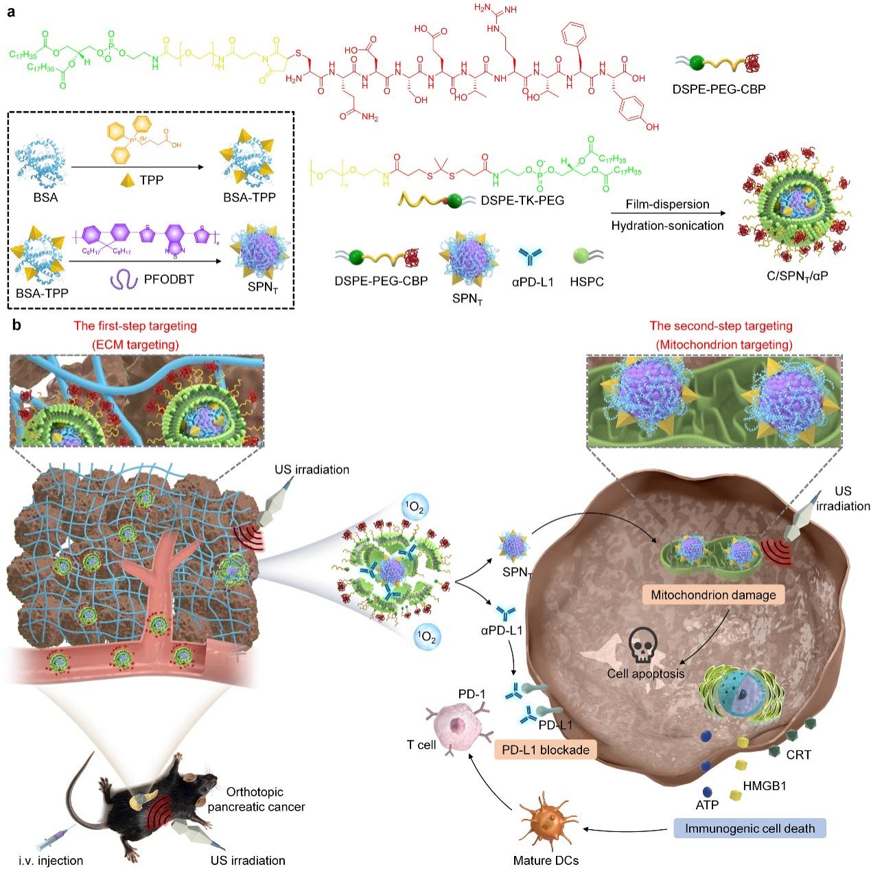 针对胰腺癌临床治疗困境,李静超研究团队设计了一种半导体纳米转换器(C/SPNT/αP),通过放大线粒体损伤和程序性死亡配体1(PD-L1)阻断,实现原位胰腺癌治疗。研究团队将含有线粒体靶向配体(TPP)和半导体聚合物(SP)的小纳米颗粒(SPNT)以及αPD-L1嵌入到声响应胶原结合肽(CBP)-偶联纳米脂质体中,形成C/SPNT/αP。在第一步ECM靶向中,C/SPNT/αP表面的CBP能够有效与ECM中的胶原结合从而实现ECM靶向,提高纳米颗粒在原位胰腺肿瘤部位的富集。在超声(US)照射下,C/SPNT/αP通过SDT使其超声响应性外壳破裂,实现按需释放SPNT和αPD-L1。此后,SPNT介导第二步线粒体靶向,并通过声动力产生单线态氧(1O2)放大线粒体在US照射下的损伤,进而放大细胞凋亡效应和ICD效应,促进免疫激活。ICD的免疫作用通过释放αPD-L1阻断PD-L1免疫抑制通路而进一步增强(图2)。这种新型的治疗策略可以有效治疗小鼠原位胰腺Panc02和KPC模型肿瘤。该研究成果以《两步靶向可调半导体纳米开关放大线粒体损伤和PD-L1阻断用于原位胰腺癌治疗》(Two-Step Targeting-Tunable Semiconducting Nanoswitches Amplify Mitochondrion Damage and PD-L1 Blockade for Orthotopic Pancreatic Cancer Therapy)为题发表在《先进功能材料》(Advanced Functional Materials)。
