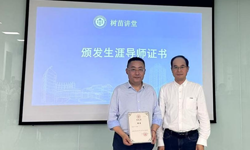 讲堂开始前,谢峰为叶劲超主任颁发“东华大学学生生涯导师”聘书。