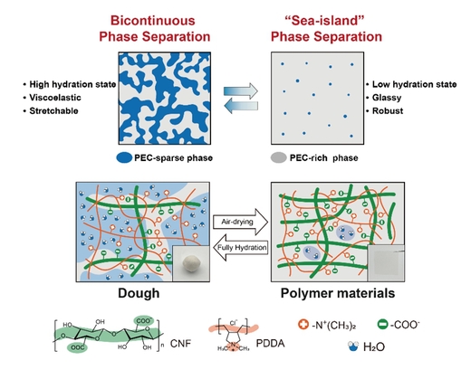 东华大学武培怡/侯磊研究团队近期提出了一种水介导相分离演化策略,通过不同水合状态下材料机械性能与再加工特性的解耦,开发出兼具优异机械性能与室温可任意加工特性的水塑性塑料。具体而言,在低水合状态下,材料呈现"海-岛"相分离结构,形成具有优异机械强度的玻璃态塑料。在完全水合状态下,水诱导的"海-岛"向双连续相分离转变促使该塑料转化为黏弹性面团态,便于重塑为任意形状,实现室温再加工(图1)。值得注意的是,通过拉伸成型工艺使塑料展现出高达211.2 MPa的断裂应力和5.6 GPa的杨氏模量。该策略为实际承重场景下高性能可持续塑料的设计提供了新思路。