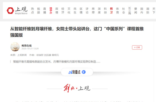 把思政教育和专业特色融合在一起,正是《锦绣中国》的魅力所在。作为上海市“中国系列”品牌课程的重要组成部分,新学期东华大学完成从《锦绣中国》到《锦绣中国》“强国版”的备课,进一步聚焦新质生产力,精心设计“纺织科学技术中的‘黑科技’”“生物材料与健康中国”“人工智能软硬件技术发展与思考”等9讲内容,让学生近距离体悟新时代伟大变革的成功案例和科技强国战略的生动实践,激发报国志向和学术志趣,推动知识传授、能力培养与价值塑造的深度融合。