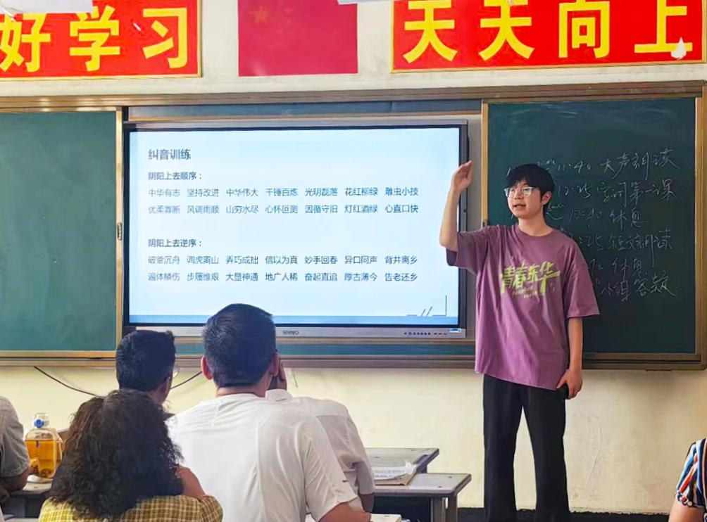 2025年暑期,9名实践团成员赴莎车县为当地45名教师提供为期7天的国家通用语言文字提升专项培训志愿服务。活动期间,实践团走进莎车县第五小学,创新采用“1+5 陪跑工作+集中授课”双轨模式,通过“一对一”访谈精准定位新疆教师发音痛点,围绕声调辨别、短文朗读等核心难点开展“真题字词攻坚”“短文朗读”“命题说话”等专项训练。同时,实践团创新推出“日清日测”闭环体系,让学员每日完成一套全真试题,并延续线上“1+5”小组答疑机制,保证考试疑问当天攻破。实践团累计完成60余课时教学,学员短文朗读能力大幅提升,所带学员普通话考试通过率大幅提升。