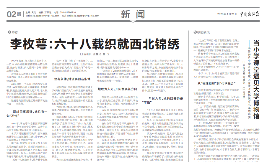从风华正茂到白发苍苍,李枚萼把最美好的年华献给了大西北的纺织教育事业。这份听党指挥、报效祖国的家国情怀,扎根基层、无私奉献的西迁精神,如一盏明灯照亮着后来者的道路,也将永远铭刻在一代代纺织人心中。(时间:2026-01-21 作者:通讯员 张捷民 董戈 来源:中国教育新闻网-中国教师报)