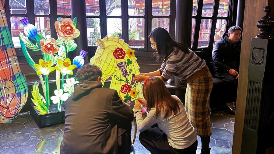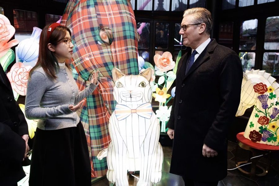 1月30日,来沪访问期间,英国首相斯塔默在豫园湖心亭收到东华大学学生设计制作的中英元素花灯艺术装置。
