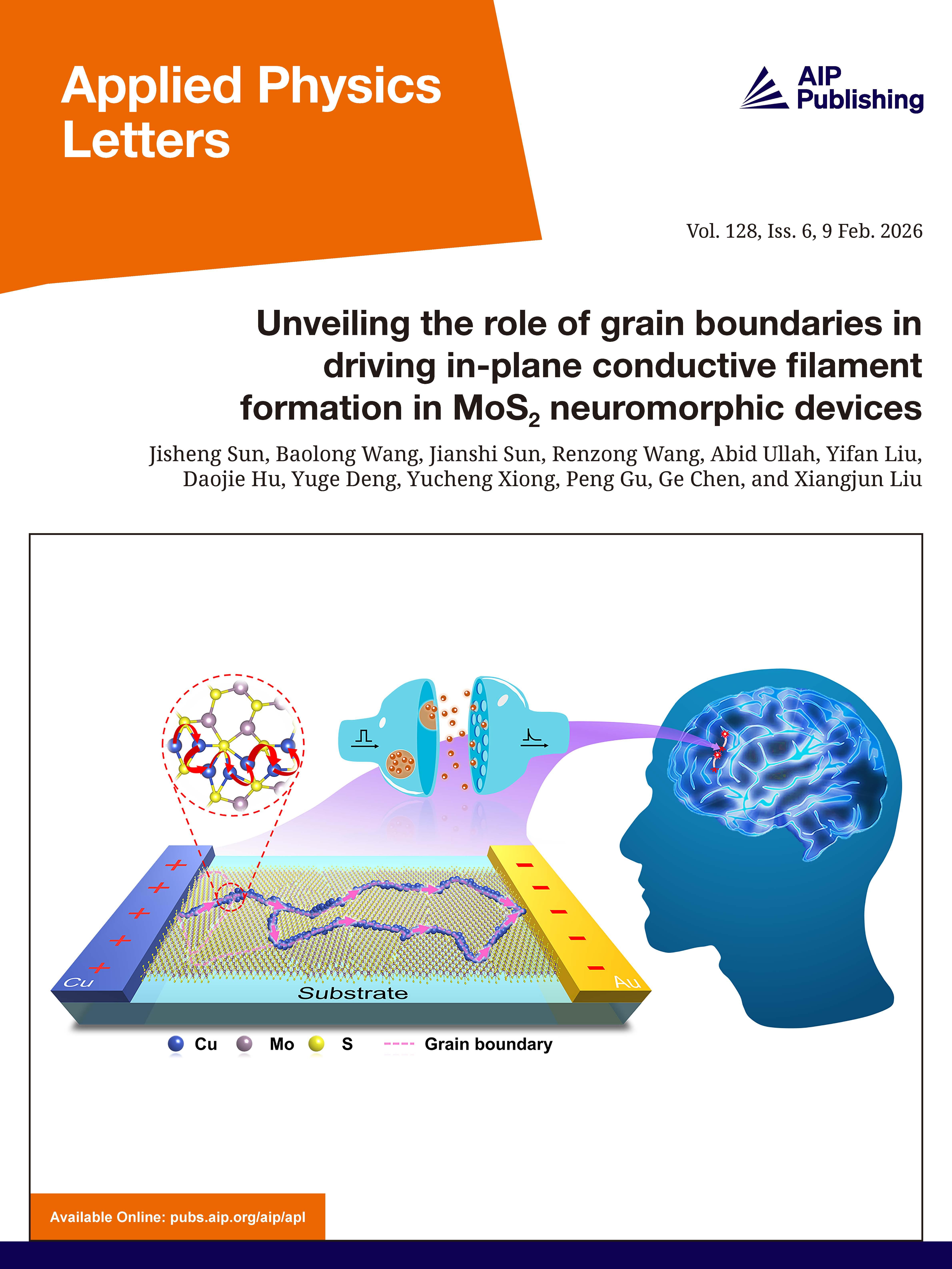 近日,机械工程学院刘向军研究员团队在基于忆阻器的类脑芯片研究方面取得重要进展,相关成果以“揭示晶界在驱动二硫化钼神经形态器件面内导电细丝形成中的关键作用(Unveiling the role of grain boundaries in driving in-plane conductive filament formation in MoS2 neuromorphic devices)”为题,发表在物理学领域知名期刊《应用物理快报》(Applied Physics Letters)上。该论文因创新性和学术影响力突出,被期刊遴选为“精选论文(Featured Article)”,并入选期刊封面文章。东华大学机械工程学院为第一单位,博士生孙骥晟为第一作者,刘向军研究员为通讯作者。