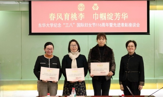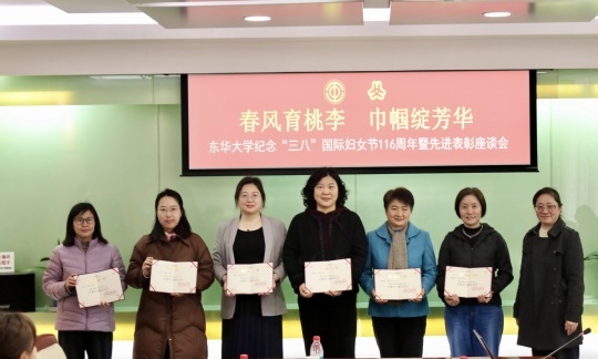 3月5日,春风育桃李 巾帼绽芳华——东华大学纪念“三八”国际妇女节116周年暨先进表彰座谈会在松江校区举行。副校长、校工会主席刘淑慧出席会议,校工会、妇工委干部,二级单位工会女工委员以及获奖人员等教师代表齐聚一堂,共庆节日,共话发展。会议由校妇工委副主任张云洁主持。