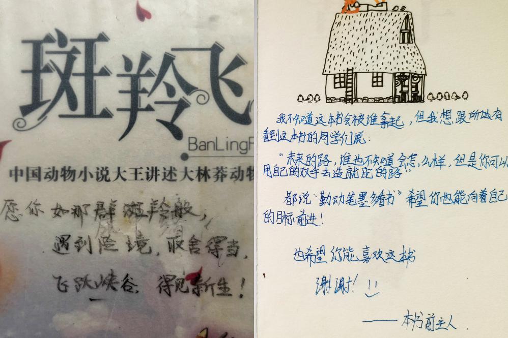 拼版照片:左右图为盐津县黄草社区农家书屋里拍摄的扉页留言。新华社发(陆志秋 摄)