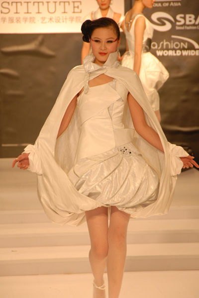动态秀以动感而极具爆发力的节奏开场,迎面走来的模特展示着一套又一套结构感强烈的服饰,分明让人感受到了中日合作班级同学扎实牢固的基本功与激流般汹涌而出的激情,不需要太多华丽鲜艳的颜色,不需要太多刻板做作的形状,也不需要过分夸张犀利的张扬笔触,他们的服装是一种语言,在这种属于设计师的语言中,思想就是一切,思想就是力量。