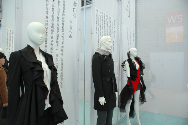 与之形成鲜明对比的是一旁的静态展区,没有热烈的掌声与欢呼,也没有人潮汹涌的热闹,她就像一位优雅的女士,静静地接受着人们的观赏。大大的介绍牌上记录的是设计师们点点滴滴的灵感来源;同时参展的还有一些已经从日本留学归来的中日班同学,他们在介绍牌上侃侃而谈,谈一年的日本行体会,谈他们的成功或失败。每一字,每一句,都仿佛在抒发他们对服装设计这一职业的无限热爱与憧憬。