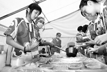 奥足赛上海赛区帐篷食堂里有9位志愿者,每日工作十多个小时,端饭舀汤、抹桌擦凳、分发水果、维持秩序……东华大学志愿者洪焰(左)是独生女儿,在家里很少料理家务,她在帐篷食堂里却干得无怨无悔。 (来源:新民晚报 日期:2008-08-22 见习记者 孙中钦 摄影报道)