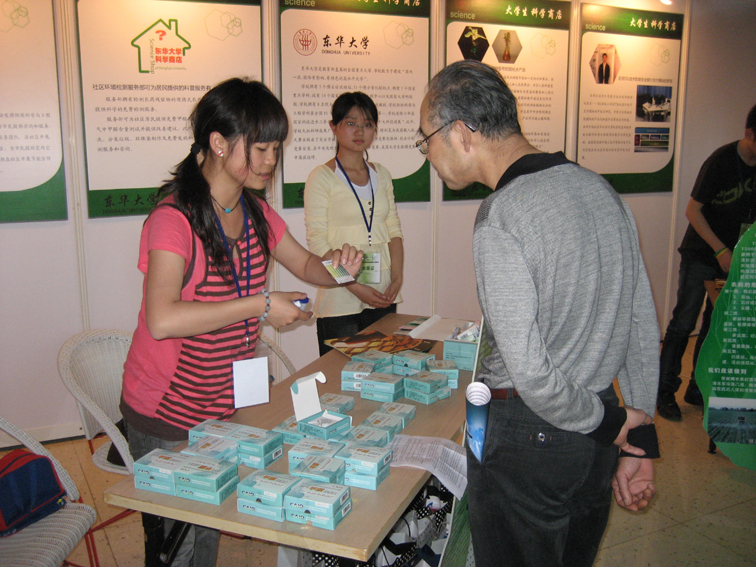 我校环境学院社区环境监测服务部作为科学商店的代表参展,展示了社区环境检测服务部在2008—2009年度从事社区科普服务以及大学生课外科技创新的成果。展台经过科普志愿者精心的布置,为参观者提供免费的家用甲醛测试试剂盒、家用活性炭包等物品,并向参展观众提供免费的残留农药速测仪使用培训、甲醛测试仪使用等科普知识,同时服务部还专门为青少年观众设计了许多科普游戏如纸巾换手帕、环保树签名等活动,吸引参观者体验和参与,得到了参展者的热情关注。
