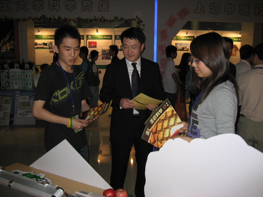 2009全国科技活动周暨上海科技节近日在上海科技馆开幕。本届科技节的科普形象“启思”是一把启迪思想的智慧金钥匙,这个活泼可爱的卡通形象将在为期一周的科技节期间活跃在遍布上海的各项科普活动中。上海市副市长沈晓明、上海市政府副秘书长翁铁慧等领导参加了开幕式。我校科学商店和上海其他九所大学科学商店一起共同参加了巡展。
