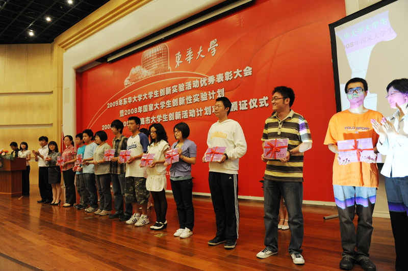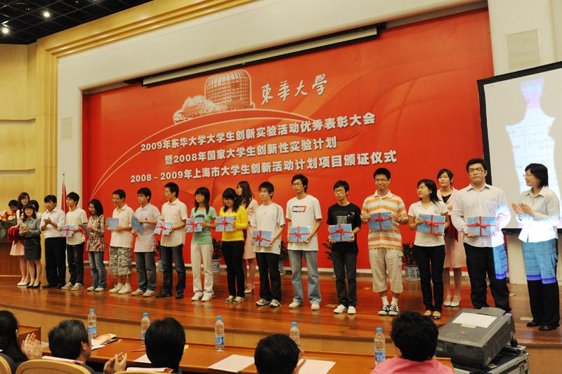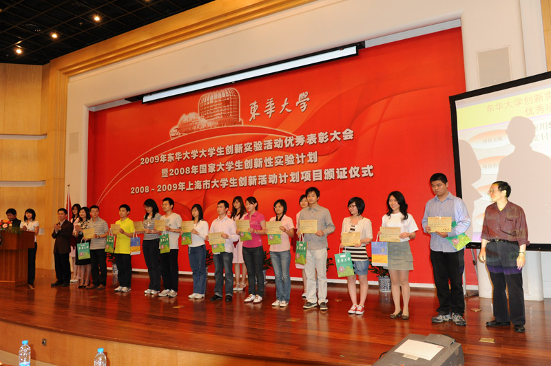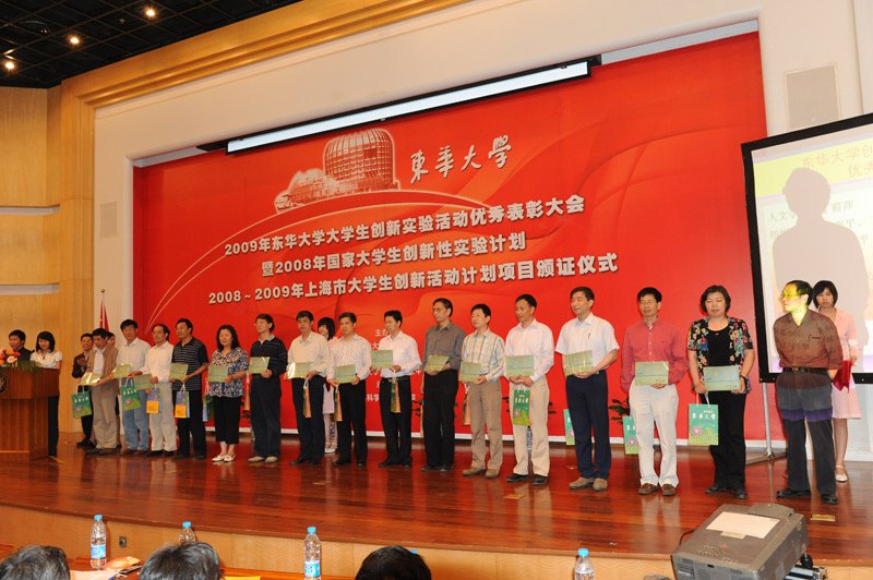 大学生创新性实验项目开展以来进展良好,许多项目已经取得了阶段性的成果,经各学院推荐,教务处、东华大学创新创业中心组织专家评审,评出了12个优秀项目和15位优秀指导老师。本次大会向参加2008-2009年120项上海市大学生创新活动计划,以及2008年20项国家大学生创新性实验计划入选项目的每位成员颁发了证书;向获得2009年东华大学大学生创新实验活动的优秀项目、优秀指导教师颁发了证书。