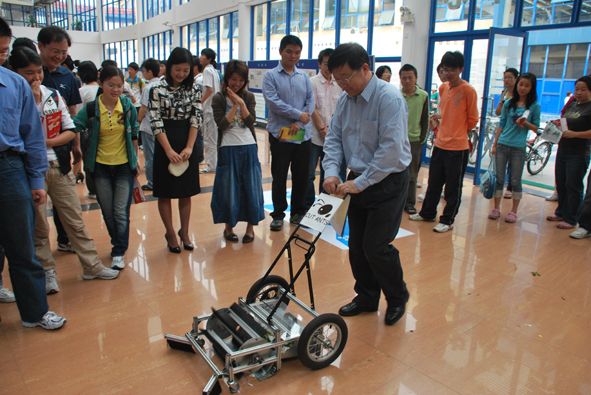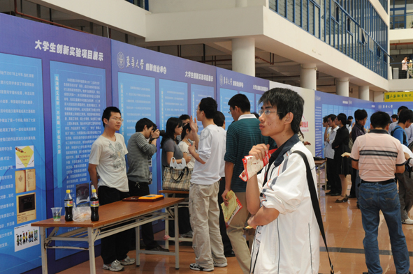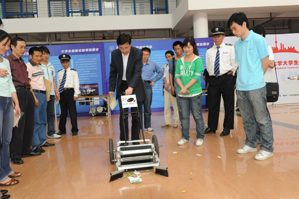 其中大学生创新实验计划参展的12件项目是从2007年以来实施的国家创新实验计划、上海市创新活动计划和校级课外科技活动众多项目中精心选择的,其中有在全国大学生创新论坛中获得十佳项目的“新一代生物固化水”,也有面向大学生为读者对象的图文并茂的“校园口语”教材,而且即将出版,还有多次获得竞赛大奖的为减轻环卫工人工作强度而设计的多功能环卫车。