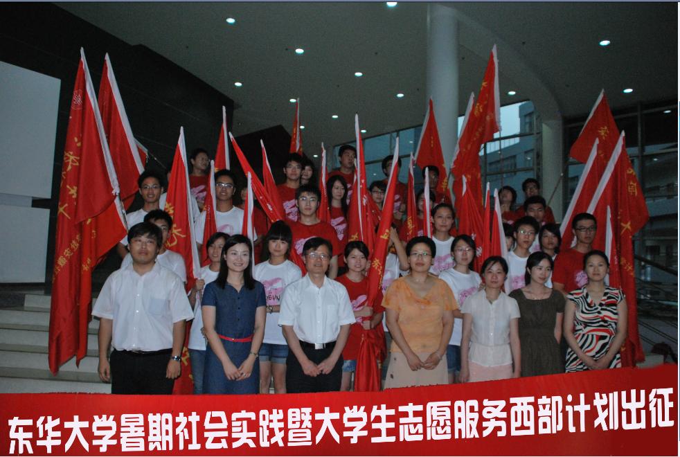 6月26日下午,2009年东华大学暑期社会实践暨大学生志愿服务西部计划出征仪式在松江校区图文信息大楼大厅举行。六月的炎炎烈日也比不上同学们火热的激情,同学们为即将奔赴祖国各地开展实践活动而热情高涨,校园内处处洋溢着青春的活力。