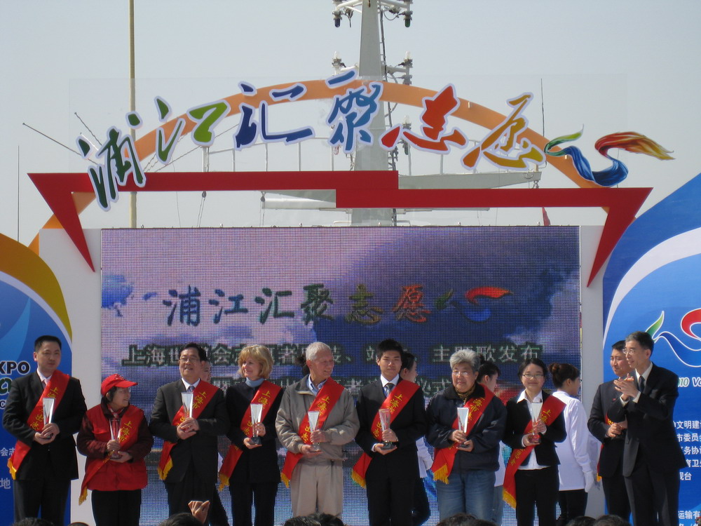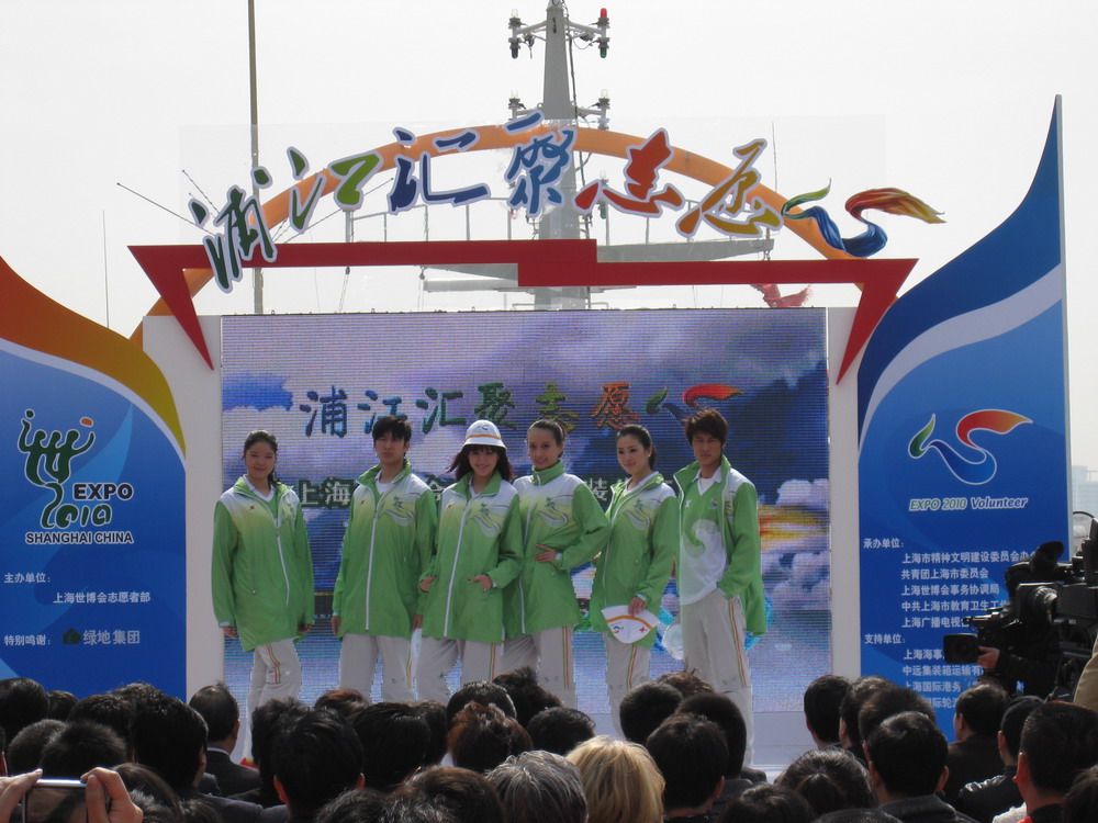仪式上,“新鉴真号”和“世博志愿者”号上的志愿者与浦江边的志愿者遥相呼应,在著名舞蹈家黄豆豆和影视演员黄奕的现场演示下,齐做“我们就在你身边,2010”世博会志愿者手势。