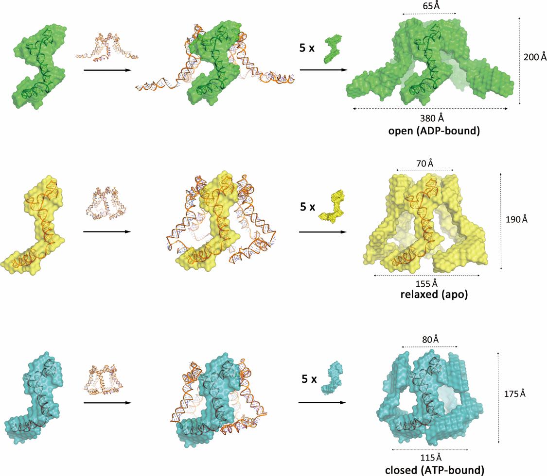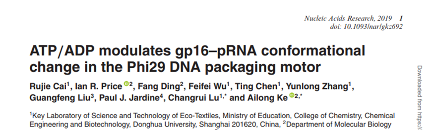 近日,我校化学化工与生物工程学院陆昌瑞教授课题组在核酸领域顶级期刊《核酸研究》(Nucleic Acids Research, IF=11.2)发表题为“ATP/ADP modulates gp16–pRNA conformational change in the Phi29 DNA packaging motor”的最新研究成果。该项研究首次获得病毒基因组包装马达末端的结构信息,捕获到其结合ATP/ADP所发生的构象变化,为临床治疗和药物设计提供可靠的理论基础,进而为病毒感染的诊断和治疗提供新思路、新靶点。我校博士生蔡汝洁为第一作者,陆昌瑞教授和康奈尔大学Ailong Ke教授并列通讯作者。东华大学化学化工与生物工程学院为第一单位。